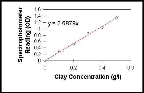 The term on the left-hand-side of equation (12) is referred to as the transformed concentration, Ct . The laboratory experiments are designed to be as simple as possible and for this study the only controlled variable is rainfall rate; all other parameters are kept as constant as possible. The experimental set-up is schematically diagramed in figure 2. A small, Plexiglas cube (7x7x7 cm) is filled with an artificial soil and leveled 2.1 meters below a rainmaker. After carefully establishing an initial pond depth of 5 cm on the soil, rain is simulated over the box and an overflow spout in the side of the box maintains constant ponding depth (Figure 2). Five experiments are run at different rain rates (15 - 100 mmh-1). Outflow is periodically collected from the overflow spout with an automatic fraction sampler. In the first stage of each experiment, samples are collected every 15 to 30 seconds (depending on the rainfall rate), later, samples are collected at longer intervals. Each experiment continues until the ponded water is completely clear, 1.5 to 5 hours depending on the rainfall rate. The sediment concentration of each sample is measured using a spectrophotometer (Bausch & Lomb, Spectronic 1001, 546.1 nM wave length). In these experiments, water is always distilled. The soil, 90% sand (180m - 212m) and 10% clay (hydrous Kaolin supplied by Englehard Corp, NJ), is prepared as a saturated mixture in order to minimize clay aggregation. The soil is put into the Plexiglas cube and allowed to settle. The surface is smoothed and leveled under the rainmaker. Pre-ponding is achieved by placing a strip of paper on the soil surface to prevent erosion during the pre-ponding process. Water is carefully pipetted onto the paper until to achieve an appropriate ponding depth after which the paper is removed with minimal disturbance to the soil. The rainmaker is then turned on and a timer started simultaneously. Rainfall is simulated using a 20 cm diameter, water-filled Marriotte cylinder rotating at about 20 rpm. The bottom end of the cylinder is pierced by hypodermic needles (B-Dâ 21g1.5). The rainmaker is placed near the ceiling of the Soil and Water Laboratory at Cornell University's Agricultural and Biological Engineering Department, 2.1 meters above the soil-cube. Rain rate is increased or decreased by adding or removing needles respectively. Needle distribution is determined by trial and error until a uniformity of 85% or greater is achieved. Uniformity is determined using nine vials (1.5 cm diameter) evenly distributed over the soil-cube position which catch 30 minutes of rain; after determining the standard deviation and average for the nine catches, uniformity=1-(standard deviation)/(average). The rain simulator produces drops of ~1.7 mm radius. Ignoring air resistance, the energy per drop is approximately 4312 ergs and the total energy per 1 mm of rain is 19.6 J m-2. This is similar to energy from the Proffitt et al. (1991) experiments, 22.8 J m-2 per 1 mm of rain, which simulated rain from 9 m above the soil surface. Upon completion of each experimental run, the samples are diluted to fit into the range of the spectrophotometer calibration curve made prior to the experiment. The calibration curve, shown in figure 3, is developed by correlating a set of solutions of known clay concentration to respective optical density (OD) readings; for these experiments OD = 2.6878[clay]. The calibration curve has an R2 value of 0.995 and an error of less than 4%. To determine the unknown soil constants, a and b, the l's are determined to best-fit the two experimental runs that represented the extreme rain intensities, P=15 mm hr-1 (run 1) and P=100 mm hr-1 (run 5). The soil constants are determined from these two l's by using the expression for l in equations (10). The soil detachability, a, is 437 mg cm-3 and the b parameter is 1.05. These values for a and b are used to model the other experiments. The depth, D, is 0.5 cm for all runs. The other parameters and model-agreement statistics for each of the five experimental runs are shown in table 1. The total mass of eroded material, M1* is determined by integrating the data over time. The R2 are consistently near 0.9 indicating good general correlation between predicted and observed sediment concentrations, c. The relative difference is consistently near 20%. Good agreement between model results and observations is seen in figure 4 which shows Ct for all the runs (R2=0.96). The detachability of a Solonchack soil determined by Proffitt et al. (1991), ~50 mg cm-3, was an order of magnitude lower than determined for the artificial soil used in this study. Such differences in soil parameters are expected because the composition of the soil used in this study is unique. The b exponent is often assumed to be unity (e.g. Sander et al., 1996, Hairsine et al. 1999) and this study generally supports this assumption with b very slightly greater than one; taking b=1 a priori minimally affects the agreement between the model and data. Proffitt et al. (1991) experimentally determined b slightly less than one, ~0.8-0.9. Figure 5 shows temporal trends of the raw data and associated model results for the extreme rain rates, P = 15 mm hr-1 (run 1) and P = 100 mm hr-1 (run 5). To avoid clutter, only two experimental runs are shown. The trends agree with the model theory. Initially, the concentration increases with time as clay is eroded from the soil and the rate of erosion decreases as the shield forms. Eventually the shield protects the soil enough that the erosion rate is sufficiently slowed such that the temporal trend in concentration is reversed; the concentration of clay in suspension decreases because more clay is leaving in the overland flow than is being eroded from the soil. In our special case of a level soil surface, the shielding approaches completeness; this claim is corroborated by the fact that the clay concentrations go to approximately zero for long times