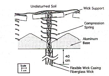 Gravity and wick pan samplers were tested in conjunction with porous cup samplers on Cornell Universitys Thompson Vegetable Crops Farm near Freeville, NY (the Freeville Site) and in the Cornell University Apple Orchard in Ithaca, NY (the Orchard Site). Gravity and wick pan samplers were installed 1 m apart, 0.6 m below the soil surface in 0.9-m long, horizontal tunnels excavated in the side of a trench. The pan consisted of a 5 by 5 grid of individually sampled compartments, and was pressed against the native soil above using screw-jack supports. The difference between the wick and gravity pan samplers was the way effluent was collected. In the 320 by 320 mm gravity pan, the 25-mm high sampling compartments were filled with pea gravel so that water dripped into the bottles from saturated soil. The undisturbed soil above each cell of the wick pan was sampled under continuous suction applied by a 0.4-m long, 9.5-mm diameter fiberglass wick. The upper end of the wick was spread over an acrylic plate, and each plate was seated on a compression spring (65 mm tall, 24 mm in diameter), assuring good contact with the soil. Each wick was encased in 13 mm (in diameter) tygon tubing and was suspended well above a collection bottle to prevent upward movement in the wick. A schematic drawing of one cell in the wick pan sampler is given in Figure 1.