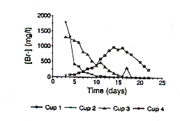 As shown in Figure 4, the four porous cup samplers at the 60 cm depth differed not only from the pan samplers, but also from each other. Porous cup 1 had a peak concentration of 968 mg/l which occurred on day 15. Porous cups 2 and 3 had high peak concentrations of 1792 and 1304 mg/l, respectively, which occurred on day 4, three days after application. Porous cup 4 did not collect except on the first day. Only three of the 100 pan sampling cells provided concentration data similar to the patterns of porous cups 2 and 3, strongly suggesting that the porous cup sampling method had distorted the flow pattern. This was confirmed at the end of the experiment when blue dye was applied shortly before the samplers were removed. Blue dye had moved along thin sampling tubes (despite careful installation), directly to the porous cup samplers at the 60 cm depth.